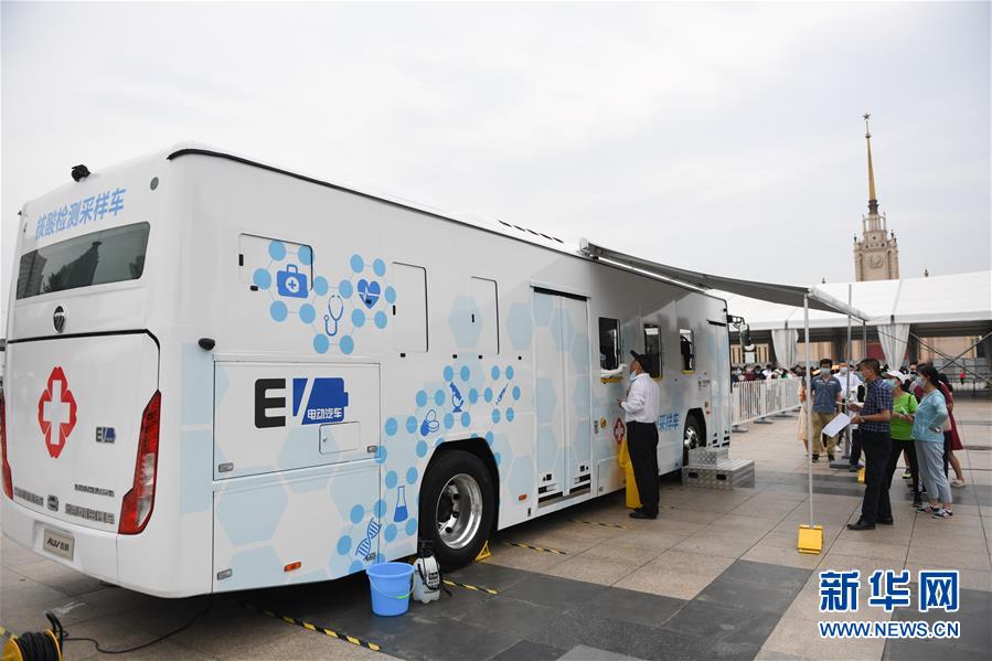 6月28日,在北京市西城区北京展览馆南侧的露天广场核酸检测采样点,前来做检测的人员在核酸检测采样车旁排队。新华社记者鞠焕宗摄