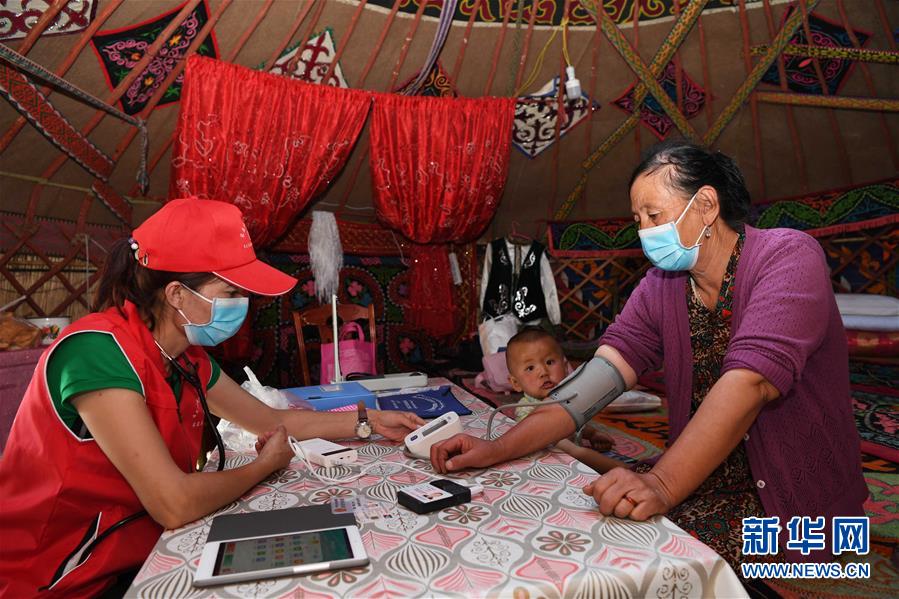 新疆布尔津县也格孜托别乡医生布勒布勒古丽·金恩斯汗(左)给牧民检查身体。新华社记者沙达提摄