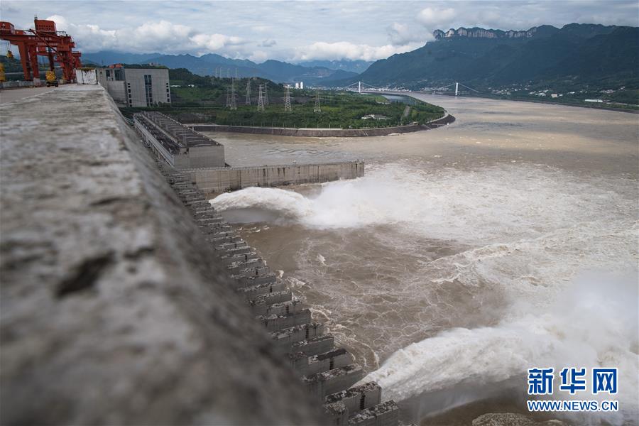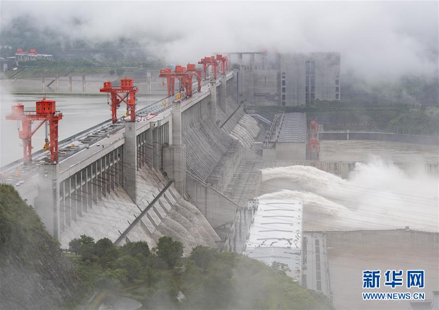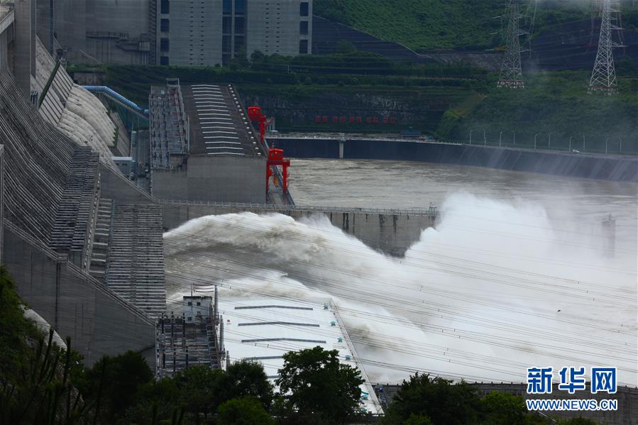 6月29日,三峡枢纽开启泄洪孔泄洪。受长江中上游强降雨影响,进入三峡水库的水量持续增多。为腾出一定库容迎接近期可能到来的洪水,三峡枢纽于6月29日上午开启两个泄洪孔,加大下泄流量。这是三峡枢纽今年首次泄洪。28日14时,三峡水库入库流量达4万立方米/秒,是27日14时的两倍。为应对此轮来水,长江防总要求将三峡水库下泄流量上调至日均3.5万立方米/秒。新华社发(郑家裕摄)