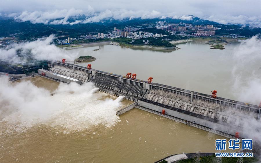 6月29日,三峡枢纽开启泄洪孔泄洪(无人机照片)。受长江中上游强降雨影响,进入三峡水库的水量持续增多。为腾出一定库容迎接近期可能到来的洪水,三峡枢纽于6月29日上午开启两个泄洪孔,加大下泄流量。这是三峡枢纽今年首次泄洪。28日14时,三峡水库入库流量达4万立方米/秒,是27日14时的两倍。为应对此轮来水,长江防总要求将三峡水库下泄流量上调至日均3.5万立方米/秒。新华社发(郑家裕摄)