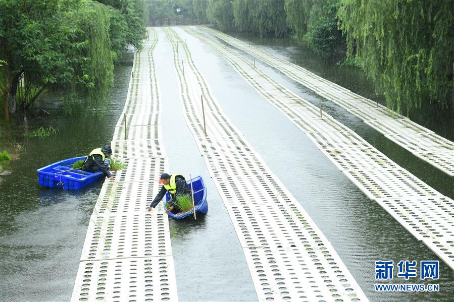 6月29日,工作人员在吴兴区湖东街道的“水上稻田”插秧。今年以来,浙江湖州吴兴区湖东街道开始在辖区河道大规模推广“水上稻田”新型农业项目,利用浮岛进行特种水稻种植,既能净化水体,又能产出生态稻谷。“水上稻田”预计在11月实现收割。新华社记者翁忻旸摄