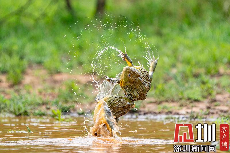 2020年6月30日报道(具体拍摄时间不详),南非波罗克瓦克,两只雄性非洲牛蛙为了争夺雌性牛蛙,在池塘中打架,这样的情形十分罕见。画面中,战况十分激烈,一只非洲牛蛙在另外一只试图逃到池塘边缘时撕咬对手,甚至将另外一只抛向空中。这些精彩的照片是由南非开普敦摄影师Temujin Johnson拍摄的。