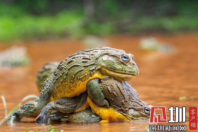 2020年6月30日报道(具体拍摄时间不详),南非波罗克瓦克,两只雄性非洲牛蛙为了争夺雌性牛蛙,在池塘中打架,这样的情形十分罕见。画面中,战况十分激烈,一只非洲牛蛙在另外一只试图逃到池塘边缘时撕咬对手,甚至将另外一只抛向空中。这些精彩的照片是由南非开普敦摄影师Temujin Johnson拍摄的。