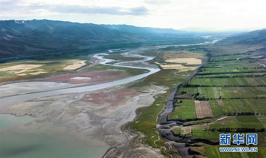 这是6月29日无人机拍摄的位于新疆特克斯县境内的喀拉托海湖风光(无人机照片)。时值夏日,位于天山脚下的新疆特克斯县境内的喀拉托海湖风光宜人,景色优美。新华社记者王菲摄