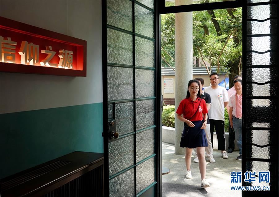 6月30日,复旦大学《共产党宣言》展示馆党员志愿服务队队员、复旦大学数学科学学院学生张晓菲引领观众入馆参观。新华社记者刘颖摄