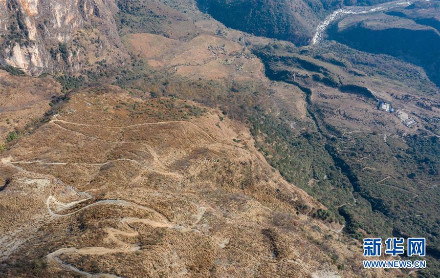 俯瞰通往阿布洛哈村的羊肠小道(2019年12月27日摄,无人机照片)。新华社记者江宏景摄