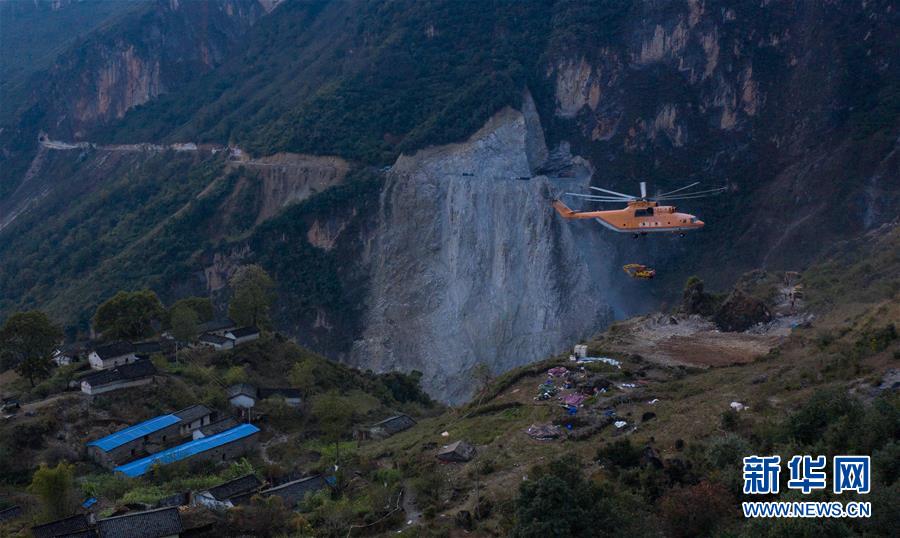 一架米-26重型直升机在布拖县阿布洛哈村吊运挖掘机(2019年12月5日摄)。新华社记者江宏景摄