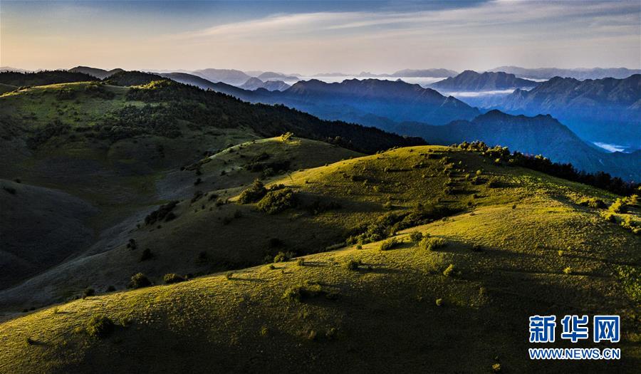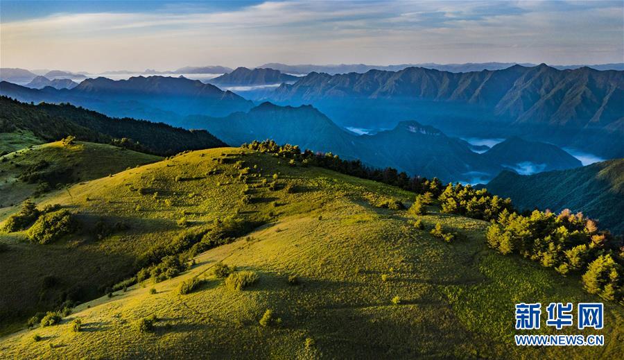 6月30日,晨曦中的神田草甸(无人机照片)。位于陕西省安康市岚皋县与重庆市城口县交界处大巴山神田主脊北坡的神田草甸,面积超过1.1万亩。夏日的朝霞中,起伏的草甸仿佛一块宽大无边的绿色地毯,镶嵌在大巴山上,如诗如画。新华社记者陶明摄
