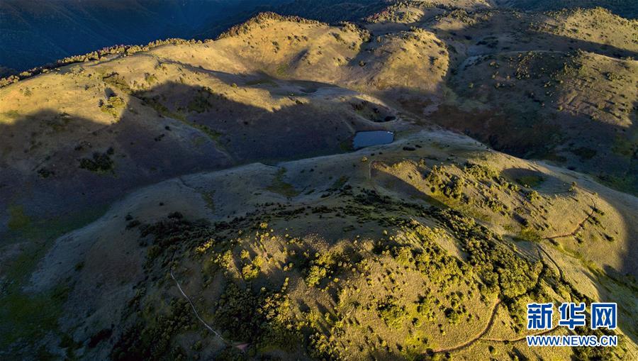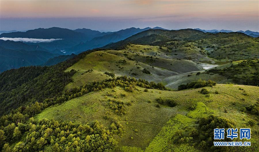 6月30日,朝霞照耀下的神田草甸(无人机照片)。位于陕西省安康市岚皋县与重庆市城口县交界处大巴山神田主脊北坡的神田草甸,面积超过1.1万亩。夏日的朝霞中,起伏的草甸仿佛一块宽大无边的绿色地毯,镶嵌在大巴山上,如诗如画。新华社记者陶明摄
