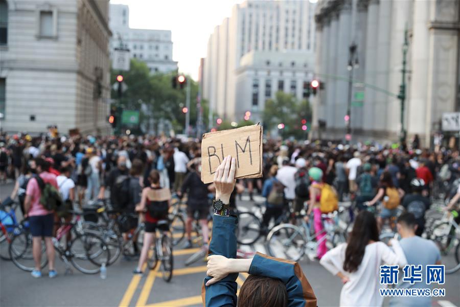 6月30日,一名抗议者在美国纽约市政厅附近手举写有“黑人的命也是命”缩写的标语参加抗议活动。由美国明尼苏达州明尼阿波利斯市非裔男子弗洛伊德遭白人警察暴力执法而死一事引发的各种抗议活动仍在纽约持续进行。新华社记者王迎摄