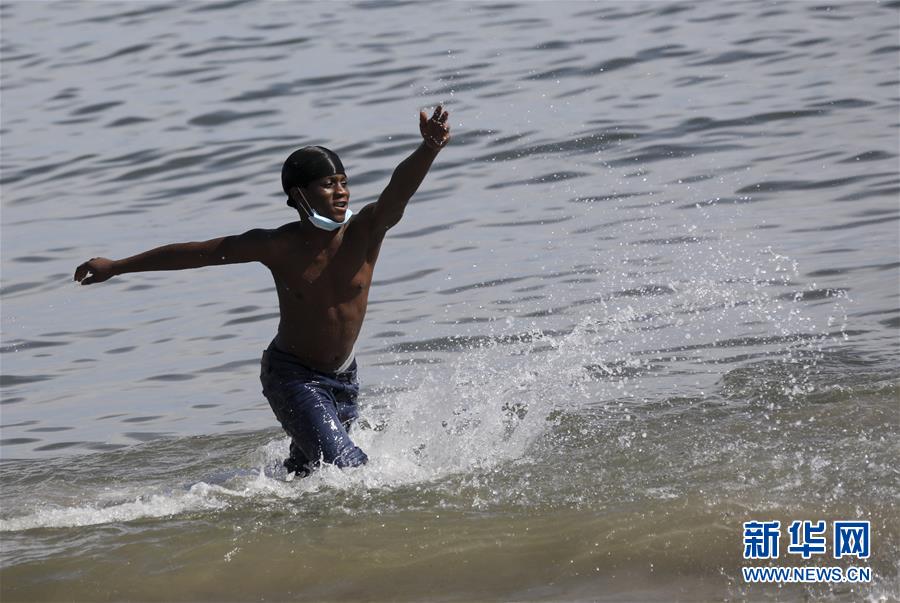 7月1日,一名少年在美国纽约科尼岛戏水。当日,美国纽约市属八处海滩正式重新准许民众游泳,救生员也同时上岗。新华社记者王迎摄