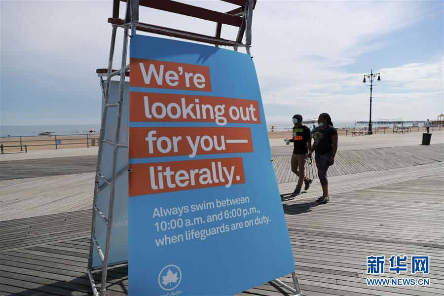 这是7月1日在美国纽约科尼岛一处海滩上拍摄的关于允许游泳时间的提示牌。当日,美国纽约市属八处海滩正式重新准许民众游泳,救生员也同时上岗。新华社记者王迎摄