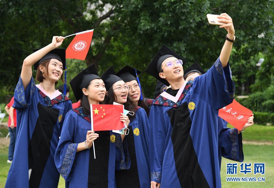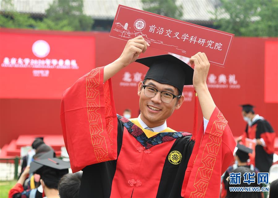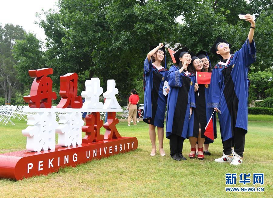 7月2日,北京大学2020届毕业生在毕业典礼结束后拍照留念。当日,北京大学举行2020年毕业典礼。由于疫情防控需要,今年的典礼在北京大学办公楼西侧广场、静园草坪、未名湖等九个会场举行,并面向全球进行中英文双语直播,仅部分在校毕业生现场参加,更多毕业生通过线上直播参与毕业典礼。新华社记者任超摄