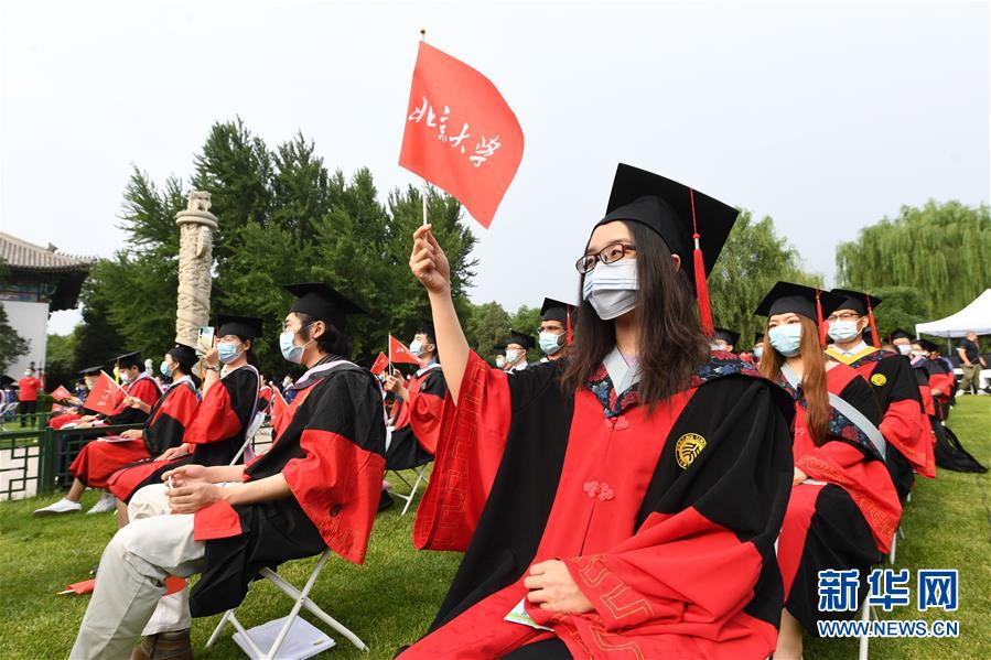 7月2日,北京大学2020届毕业生在毕业典礼上。当日,北京大学举行2020年毕业典礼。由于疫情防控需要,今年的典礼在北京大学办公楼西侧广场、静园草坪、未名湖等九个会场举行,并面向全球进行中英文双语直播,仅部分在校毕业生现场参加,更多毕业生通过线上直播参与毕业典礼。新华社记者任超摄
