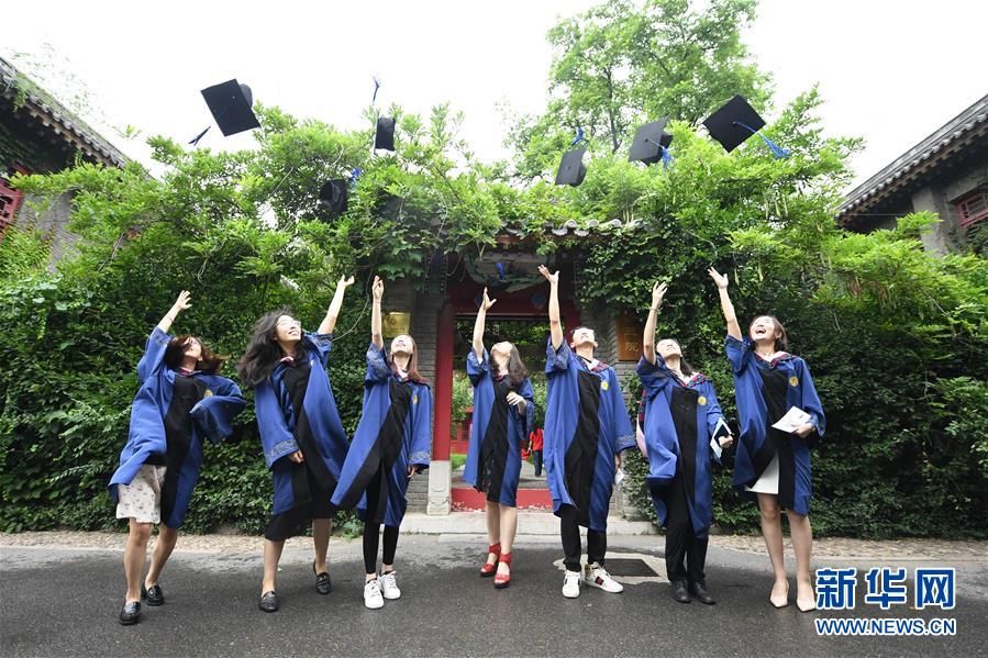 7月2日,在北京大学静园三院门口,毕业生在抛硕士帽。当日,北京大学举行2020年毕业典礼。由于疫情防控需要,今年的典礼在北京大学办公楼西侧广场、静园草坪、未名湖等九个会场举行,并面向全球进行中英文双语直播,仅部分在校毕业生现场参加,更多毕业生通过线上直播参与毕业典礼。新华社记者任超摄