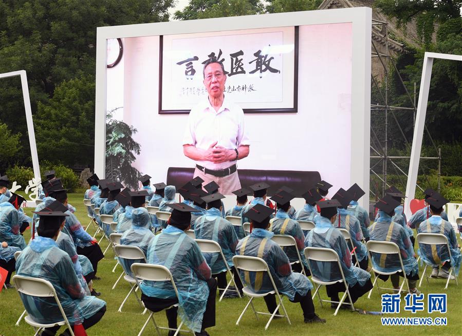 7月2日,2020届毕业生在毕业典礼上观看校友代表、国家呼吸系统疾病临床医学研究中心主任钟南山发言视频。当日,北京大学举行2020年毕业典礼。由于疫情防控需要,今年的典礼在北京大学办公楼西侧广场、静园草坪、未名湖等九个会场举行,并面向全球进行中英文双语直播,仅部分在校毕业生现场参加,更多毕业生通过线上直播参与毕业典礼。新华社记者任超摄