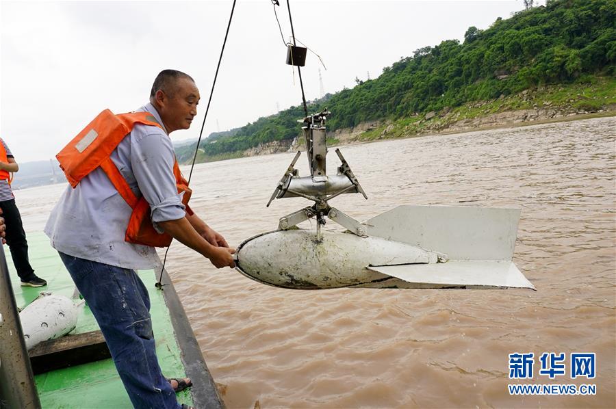 7月2日,在水文作业船上,长江清溪场水文站工作人员将水样采集铅鱼放入水中。