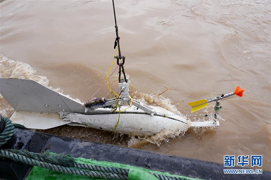 7月2日,装有流速测量仪器的铅鱼完成测量作业后,由吊车吊出长江水面。新华社记者刘潺摄