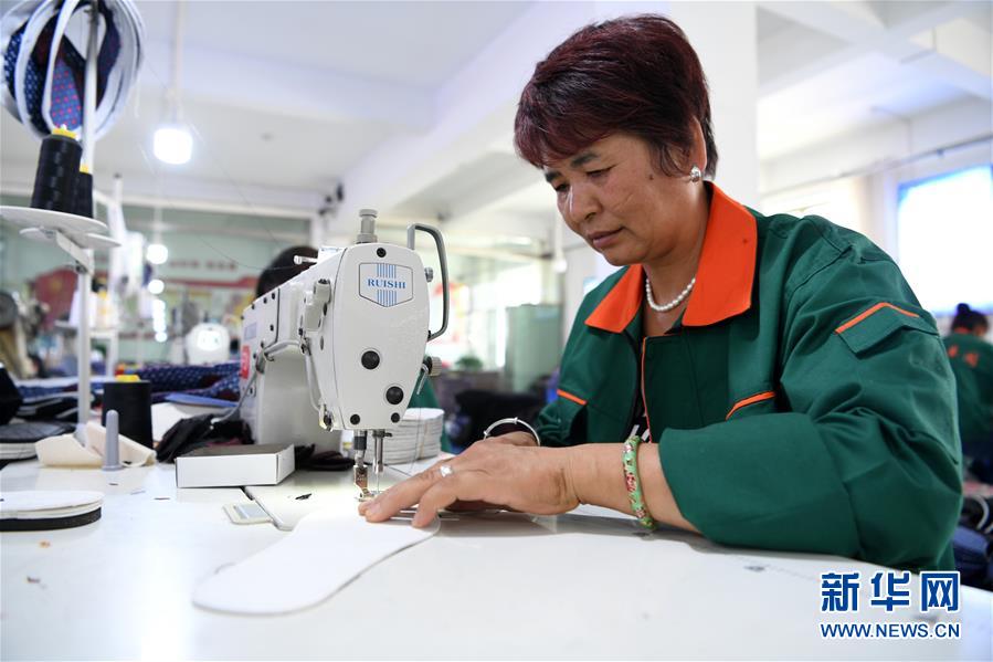 7月2日,临夏县百利布鞋加工农民专业合作社员工在加工布鞋。甘肃省临夏回族自治州临夏县将布鞋加工定为重点扶持发展的产业,采用“政府+公司+贫困户”的产业扶贫模式,由政府主导、企业出资,在贫困村建设“扶贫车间”,吸纳贫困群众从事布鞋加工产业增加收入。截至2019年底,当地布鞋加工企业和加工户遍及近百个行政村,从业人员达到4000多人,累计生产布鞋600多万双,实现销售收入2.32亿元。新华社记者范培珅摄