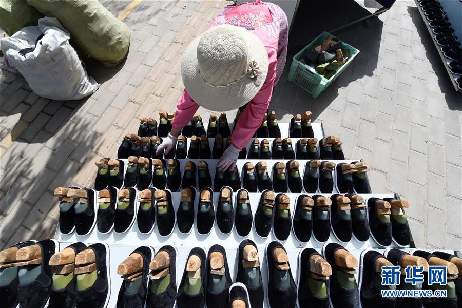 7月2日,临夏县百利布鞋加工农民专业合作社员工在摆放布鞋。甘肃省临夏回族自治州临夏县将布鞋加工定为重点扶持发展的产业,采用“政府+公司+贫困户”的产业扶贫模式,由政府主导、企业出资,在贫困村建设“扶贫车间”,吸纳贫困群众从事布鞋加工产业增加收入。截至2019年底,当地布鞋加工企业和加工户遍及近百个行政村,从业人员达到4000多人,累计生产布鞋600多万双,实现销售收入2.32亿元。新华社记者范培珅摄
