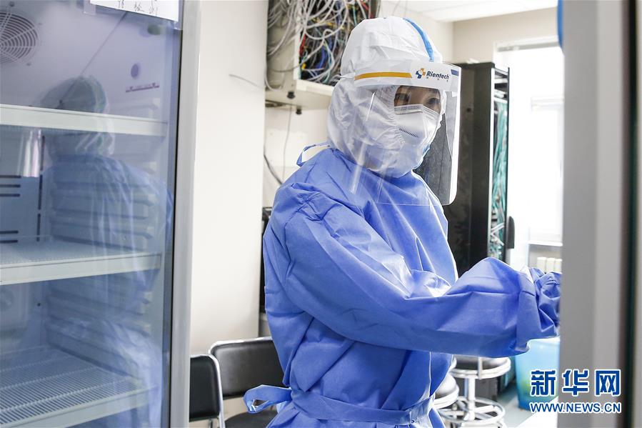 7月3日,中日友好医院检验科新冠核酸检测实验室的检验人员闫克芹在进入污染区前穿戴防护装备。新华社记者张玉薇摄