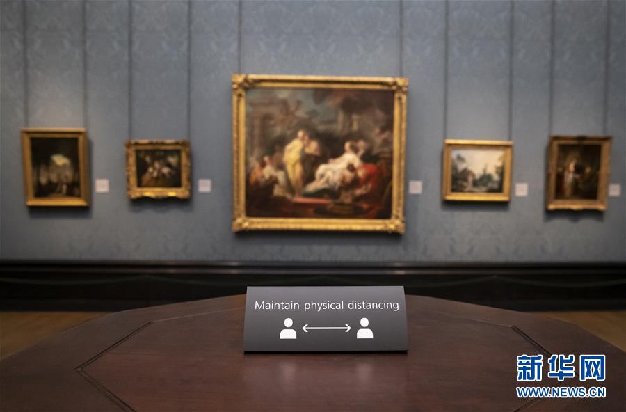 这是7月4日在英国国家美术馆拍摄的提醒人们保持安全距离的提示牌。新华社记者韩岩摄