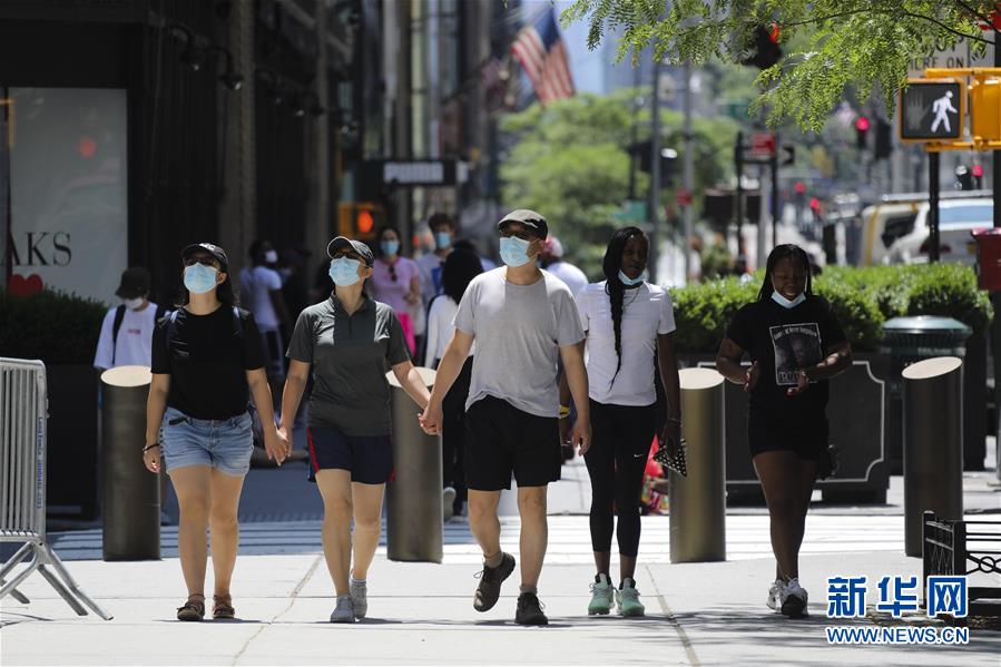 7月4日,人们戴着口罩走在美国纽约第五大道。当日是美国独立日,美国多地疫情仍面临严峻形势。美国约翰斯·霍普金斯大学实时统计数据显示,美国累计新冠确诊病例4日已超过280万例。新华社记者王迎摄