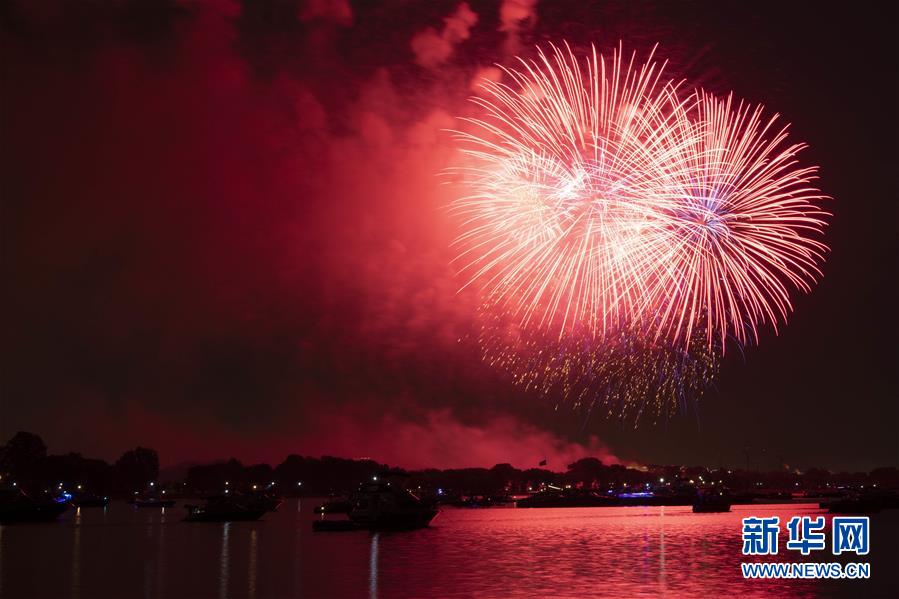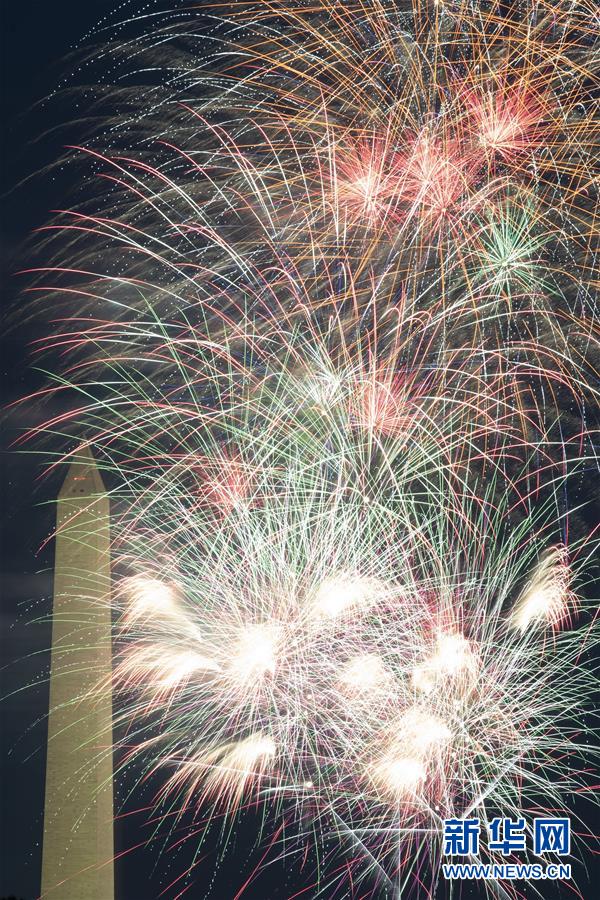 7月4日,焰火在美国华盛顿上空绽放,庆祝美国独立日。当日是美国独立日,美国多地疫情仍面临严峻形势。美国约翰斯·霍普金斯大学实时统计数据显示,美国累计新冠确诊病例4日已超过280万例。新华社记者刘杰摄
