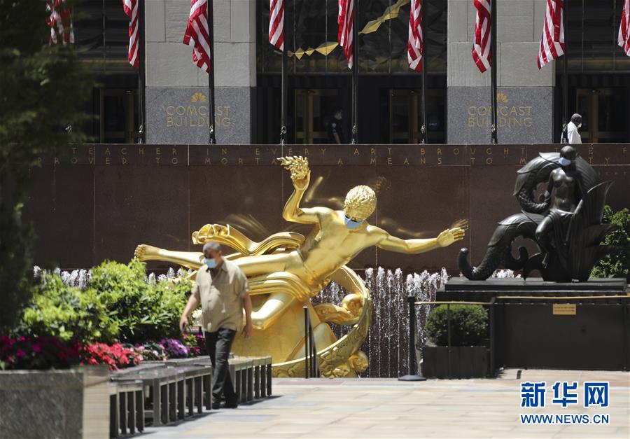 7月4日,一名男子从美国纽约洛克菲勒中心一尊戴口罩的雕像前走过。当日是美国独立日,美国多地疫情仍面临严峻形势。美国约翰斯·霍普金斯大学实时统计数据显示,美国累计新冠确诊病例4日已超过280万例。新华社记者王迎摄