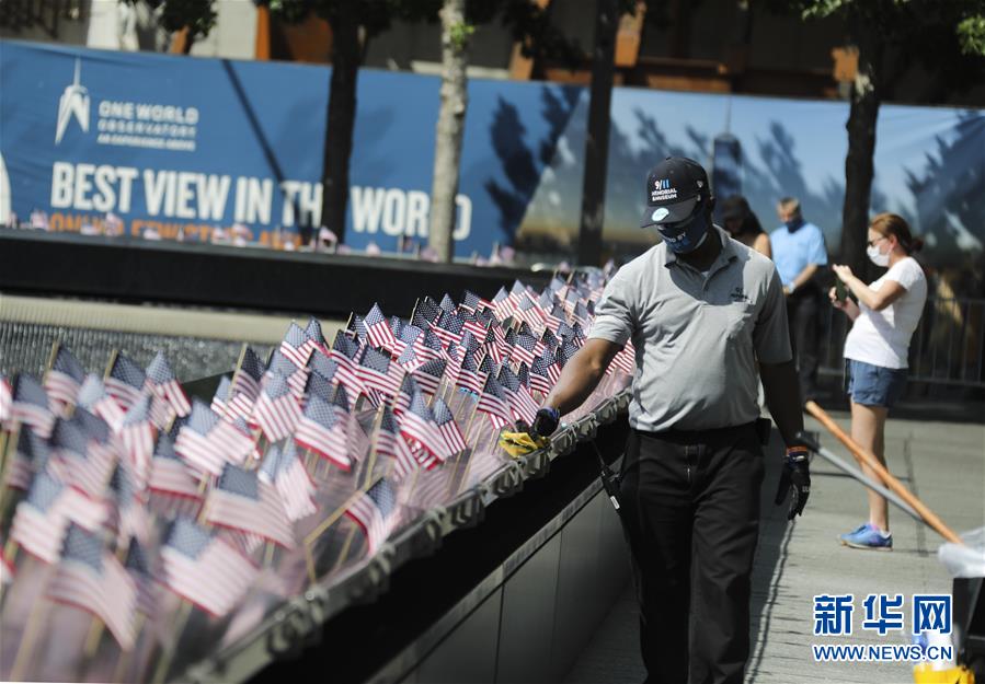 7月4日,工作人员在当日重新开放的美国纽约“9·11”世贸中心遗址做清洁。当日是美国独立日,美国多地疫情仍面临严峻形势。美国约翰斯·霍普金斯大学实时统计数据显示,美国累计新冠确诊病例4日已超过280万例。新华社记者王迎摄