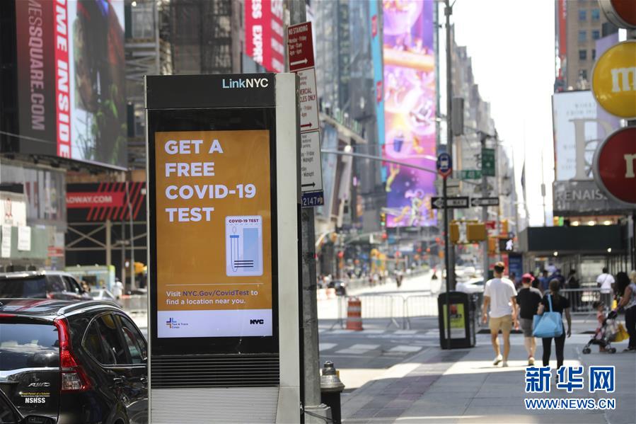 这是7月4日在美国纽约时报广场附近拍摄的显示新冠检测信息的显示屏。当日是美国独立日,美国多地疫情仍面临严峻形势。美国约翰斯·霍普金斯大学实时统计数据显示,美国累计新冠确诊病例4日已超过280万例。新华社记者王迎摄