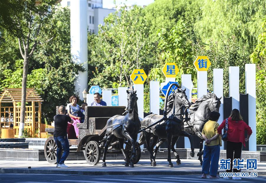 7月5日,游客在六星街的马车雕塑前观光拍照。新华社记者王菲摄
