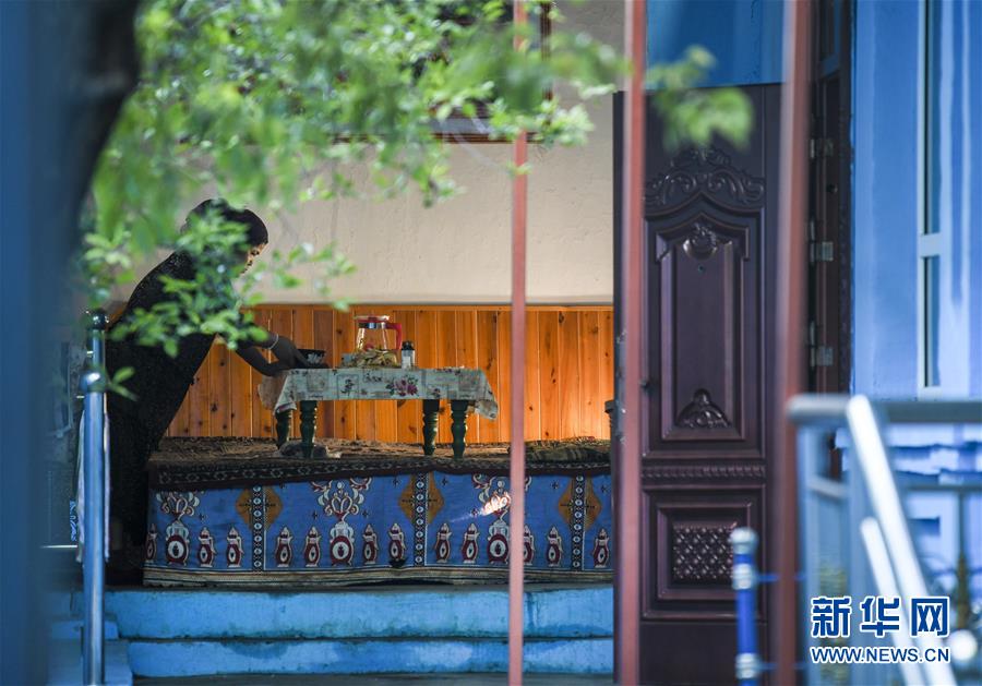 7月4日,在位于六星街内的一家民居前,房主麦尔比岩·艾买提江(左)和母亲在售卖自家制作的酸奶。新华社记者王菲摄