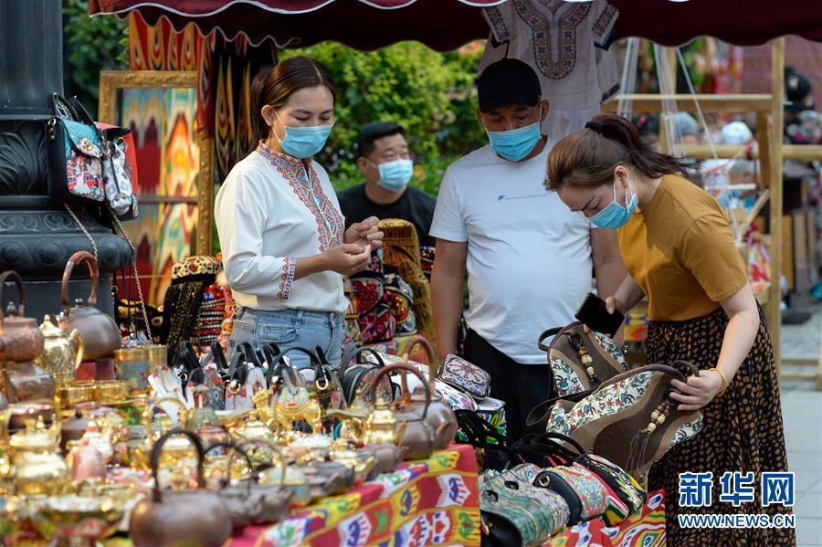 游客在乌鲁木齐大巴扎景区选购商品(7月4日摄)。夏日周末,乌鲁木齐市大巴扎景区内熙熙攘攘,人们来到这里品尝美食、休闲购物。2018年,经过靓化改造后的大巴扎景区新增长约800米的步行街,分为文创文旅和“非遗”项目街区、国际时尚街区和大巴扎美食街区,是乌鲁木齐最受欢迎的旅游目的地之一。新华社记者丁磊摄