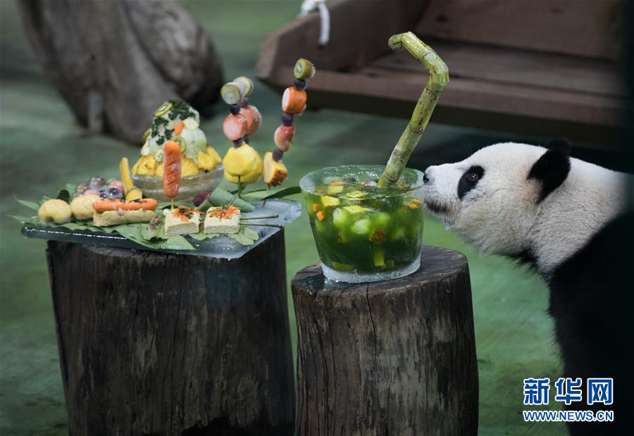 7月6日,在台北市立动物园,大熊猫“圆仔”正在品尝特制的生日蛋糕。新华社记者金立旺摄