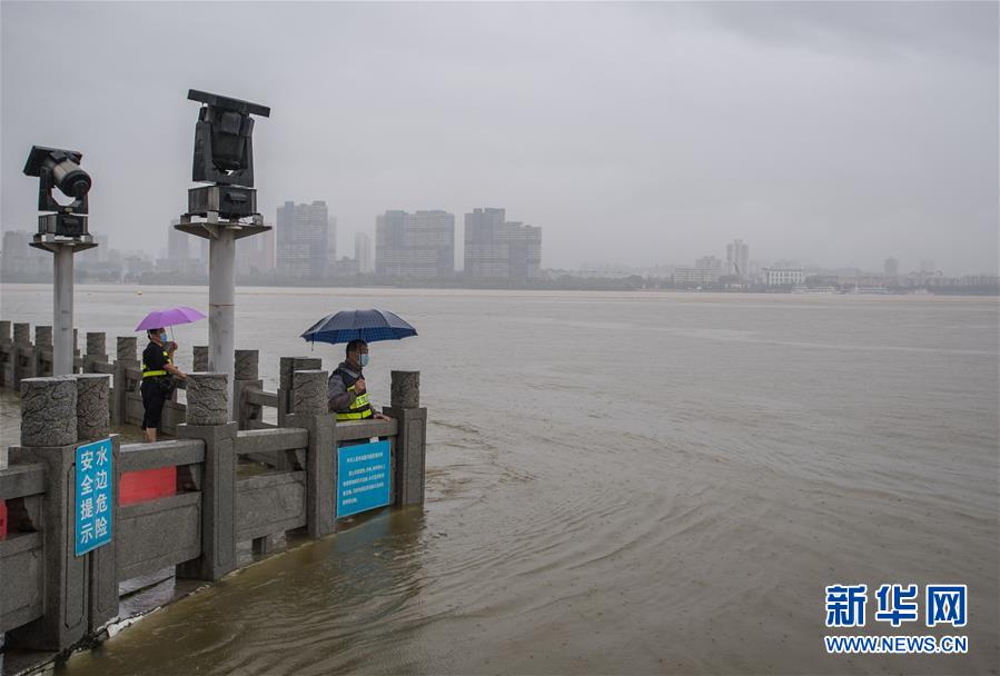 7月6日,工作人员在武汉龙王庙观察水情。记者6日从武汉市防汛抗旱指挥部办公室获悉,5日以来,武汉遭暴雨袭击,全市多处路段渍水。至6日4时,长江汉口站超设防水位1.79米,汉江新沟站超警戒水位0.01米。鉴于当前水雨汛情和渍涝情况,武汉市从6日5时起,将排涝应急响应级别提升至Ⅱ级;从6时30分起,将防汛应急响应级别提升至Ⅱ级。新华社记者肖艺九摄
