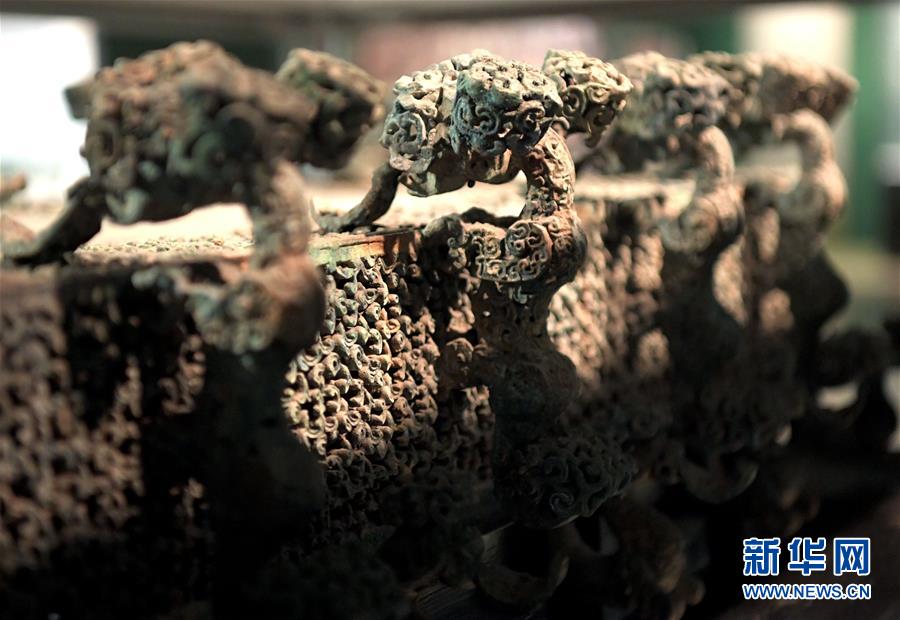 这是河南博物院展厅里的云纹铜禁局部(2019年11月18日摄)。新华社记者李安摄