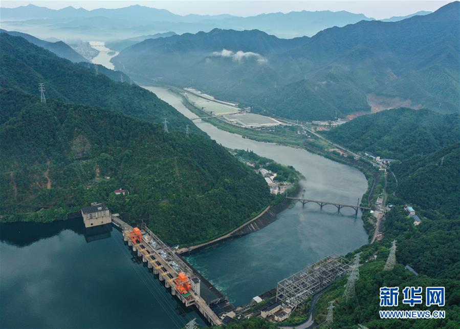 7月6日拍摄的新安江水库(无人机照片)。受连续强降雨影响,位于浙江建德的新安江水库水位持续上涨。据浙江省水利厅发布的数据,截至7月6日14时,水库水位上涨至106.54米,超汛限水位0.04米,且仍在上涨中。为确保水库防洪安全、合理利用水资源,新安江水库预计于7月7日开启泄洪闸泄洪。新华社记者翁忻旸摄