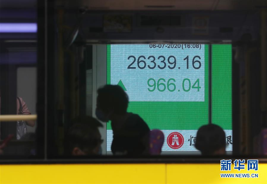 7月6日,人们从位于香港中环的股市信息屏前经过。香港恒生指数6日涨966.04点,涨幅3.81%,收报26339.16点。全日主板成交2507.97亿港元。新华社记者李钢摄