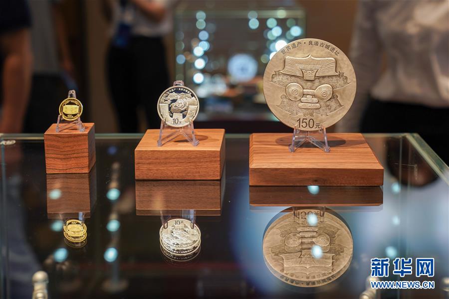 这是首发仪式现场展示的纪念币(7月6日摄)。7月6日,正值良渚古城遗址成功申报世界文化遗产一周年。中国人民银行于当天发行世界遗产(良渚古城遗址)金银纪念币一套,首发仪式在浙江良渚古城遗址公园举行。新华社记者殷晓圣摄