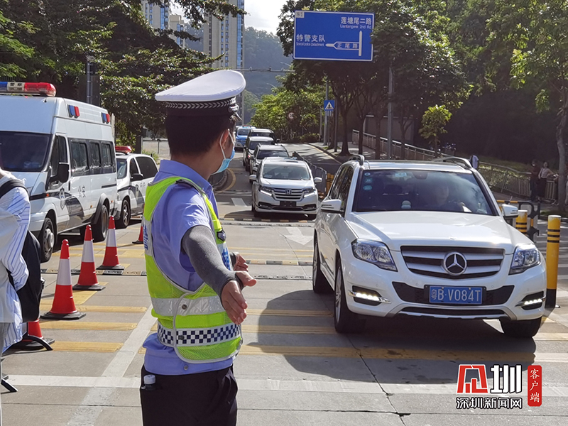 红岭中学考点门口正在指挥车辆通行的交警。