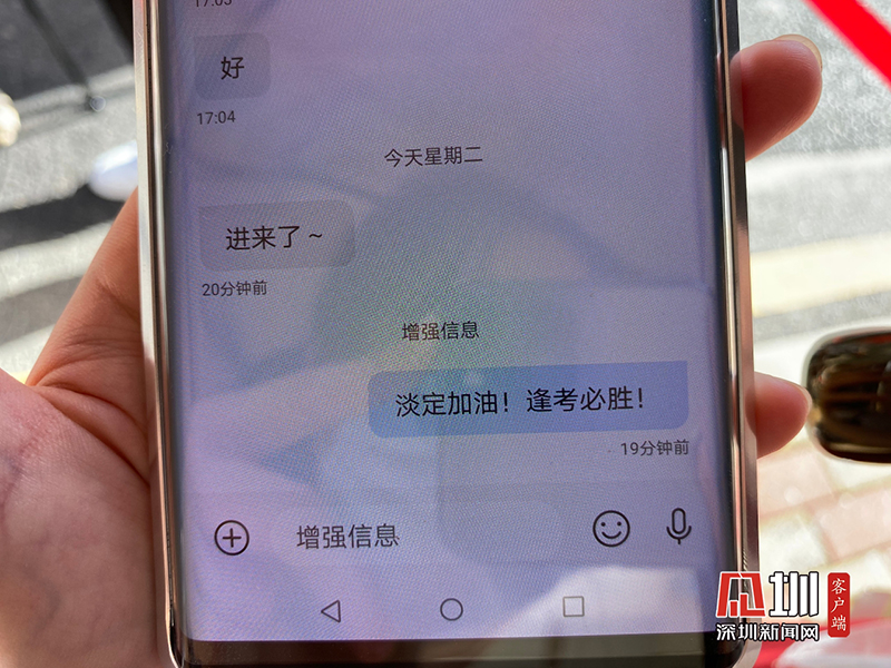 陈女士向记者展示给孩子发的高考加油短信:淡定,加油,逢考必胜。
