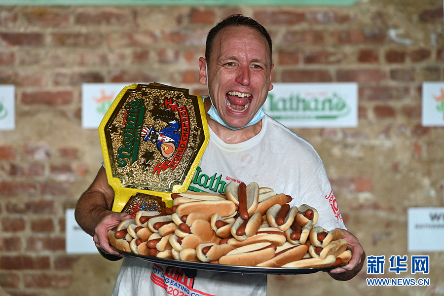 7月4日,美国纽约布鲁克林举行一年一度的国际吃热狗比赛,乔伊·切斯纳特以吃75个热狗的成绩赢得男子赛区冠军,创下了新的世界纪录。(图片来源:视觉中国)