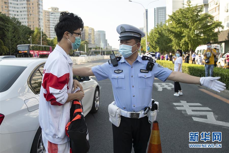 7月7日,在位于北京的中国人民大学附属中学考点外,北京市公安局公安交通管理局海淀交通支队中关村大队交警殷宏伟(右)指挥前来送考生的车辆有序停好,引导考生迅速前往考点。当日,2020年高考拉开帷幕。新华社记者沈伯韩摄