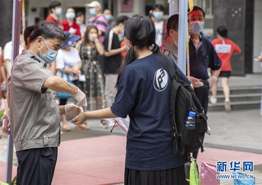 7月7日,江西省南昌市豫章中学考点工作人员为考生测量体温。当日,2020年高考拉开帷幕。新华社记者张浩波摄