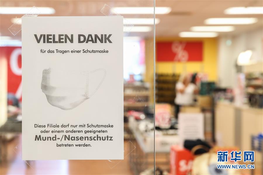 这是7月7日在德国首都柏林拍摄的一间商铺张贴着提示顾客佩戴口罩的告示。针对有地方官员呼吁取消民众乘坐公交车和在商场购物时须戴口罩的规定,德国联邦政府6日表示,支持延续“口罩强制令”。4月底,德国全部16个联邦州陆续出台“口罩强制令”,即居民在乘坐公交车和购物时须佩戴口罩。新华社记者单宇琦摄