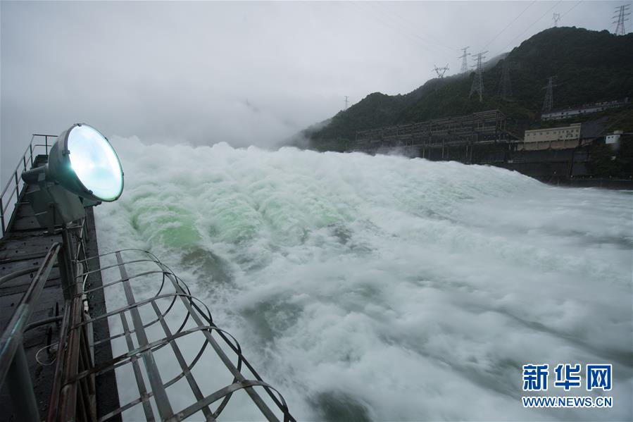 7月7日下午开启7孔泄洪的新安江水库。受持续降水影响,浙江新安江水库水位持续快速上升。继当日10时开启3孔、12时开启5孔泄洪后,新安江水库于16时增加到7孔泄洪。新安江水库是华东地区最大的水库,在钱塘江流域的防洪度汛中起到关键作用。新华社记者翁忻旸摄