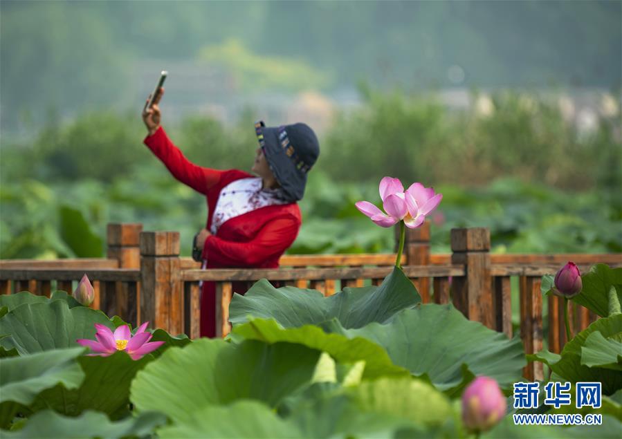 7月7日,游客在唐山市南湖公园内的观荷栈桥上拍照。近日,河北省唐山市南湖公园内荷花竞相绽放,呈现出“接天莲叶无穷碧,映日荷花别样红”的美丽景象,吸引了众多游客前来观赏。新华社记者杨世尧摄