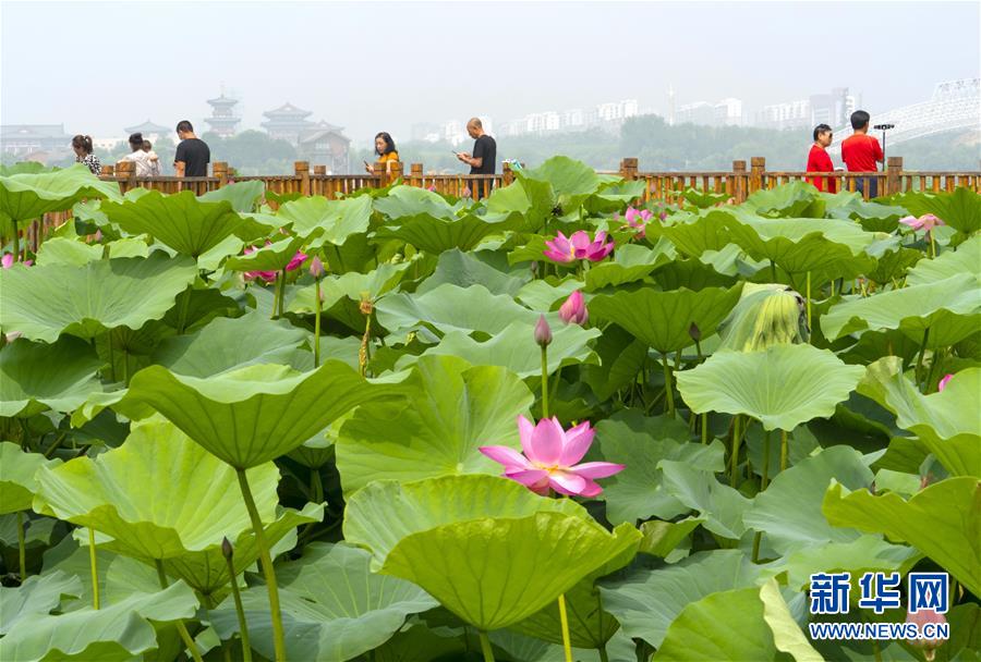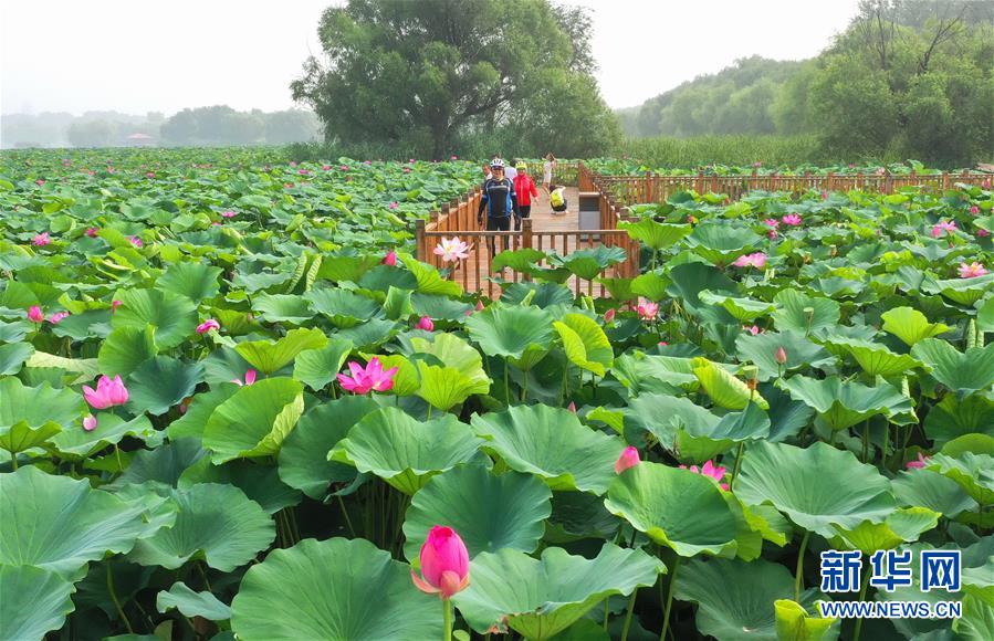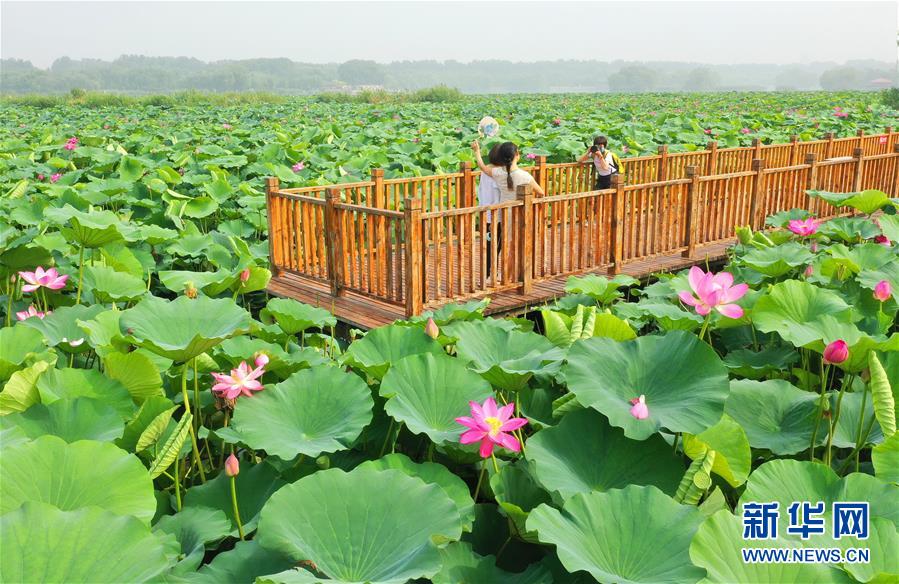 7月7日,游客在唐山市南湖公园内的观荷栈桥上拍照。近日,河北省唐山市南湖公园内荷花竞相绽放,呈现出“接天莲叶无穷碧,映日荷花别样红”的美丽景象,吸引了众多游客前来观赏。新华社记者杨世尧摄
