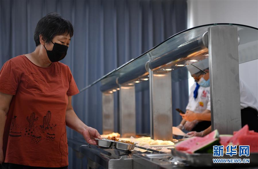7月7日,老人在付村康养中心(老人家食堂)打餐。近日,天津市西青区精武镇付村康养中心(老人家食堂)运营已步入正轨。该老人家食堂面积约850平方米,由专业餐饮企业负责日常运营,并享受政府补贴,可满足付村及周边老人的就餐需求,还能提供外带、送餐服务。据了解,为切实解决老年人吃饭难问题、增加老年人幸福感,西青区将老人家食堂建设纳入2020年区政府民心工程。目前,已建成51家老人家食堂。新华社记者李然摄